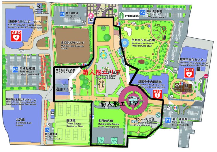 23日は準備のため、だるまちゃん広場はふわふわ雲のトランポリン、かざぐるま塔以外の場…